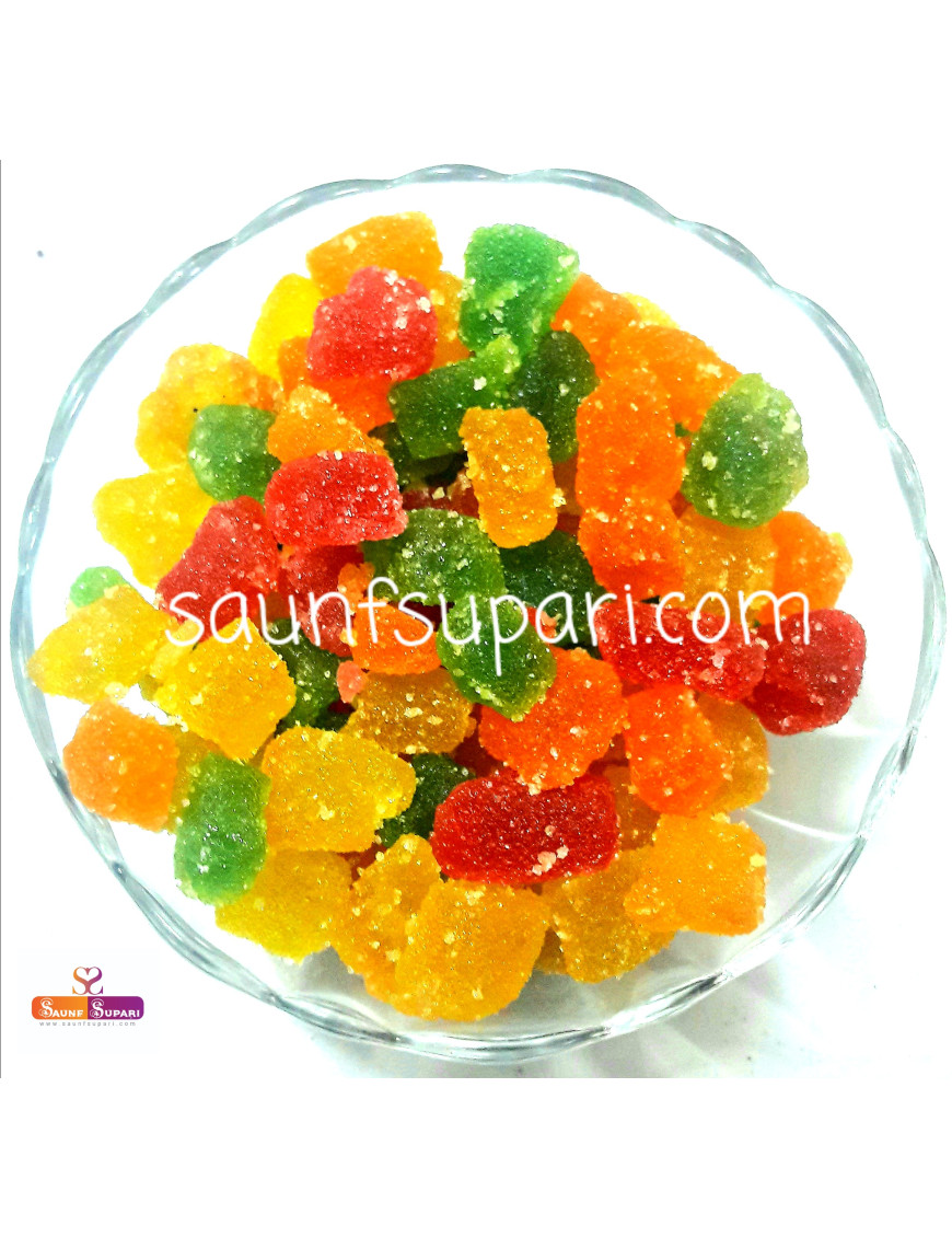 Ingredients: sugar, liquid glucose,fruit juice(orange juice,pineapple juice,raw mango juice,strawberry juice,grape juice) 10%, thickener,acidity regulator,permitted food colors & flavours.